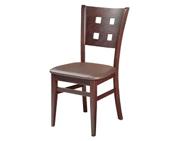 כסא פינת אוכל מעץ. מידות: רוחב 45 ס"מ עומק 43 ס"מ גובה מושב 45 ס"מ גובה משענת גב 90 ס"מ ניתן להזמין בגוון אגוז כהה בלבד. ריפוד דמוי עור חום כהה.