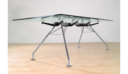 שולחן ישיבה דגם 923 פלטה זכוכית מחוסמת שקופה או פלטה MDF בגוון אפוקסי לבן רגלי מתכת מצופות ניקל מידות : 180/90/75H 200/100/75H 240/100/75H 320/110/75H