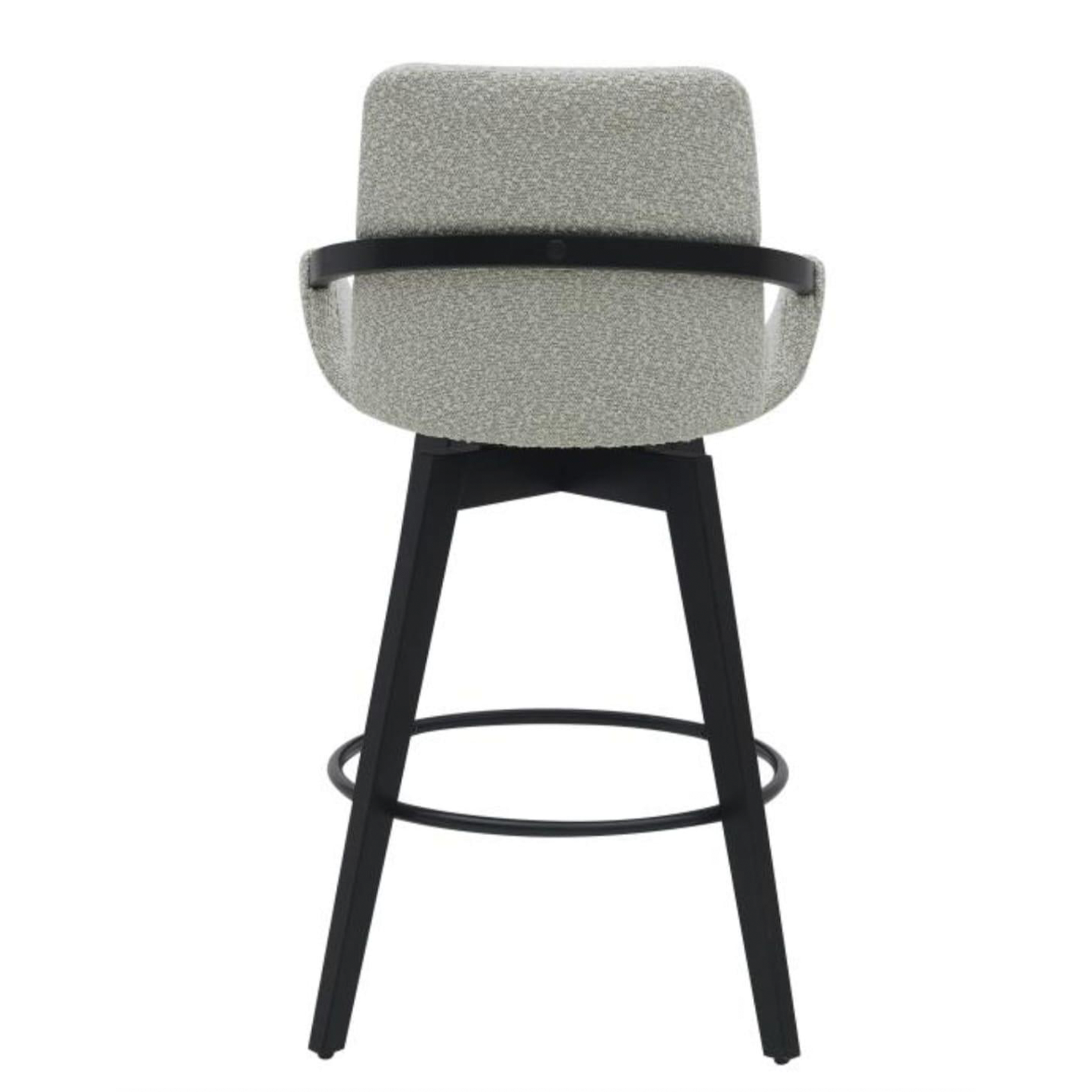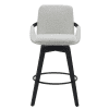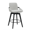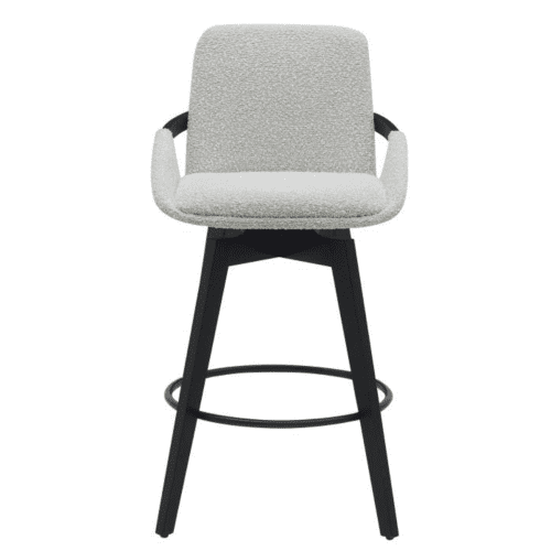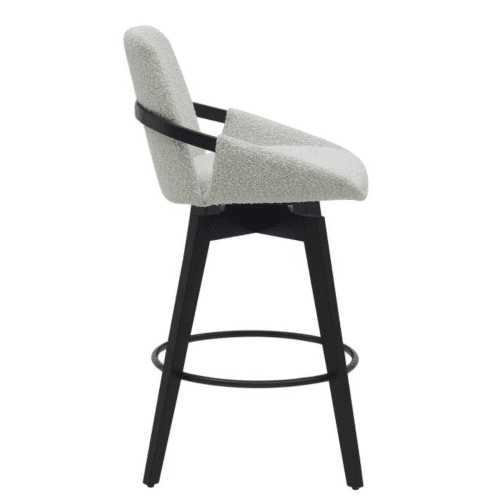 כיסא בר אלגנטי מסתובב 360 מעלות, בעל עיצוב של שלד מתכת בגוון פליז ומושב עץ עם כרית וגב מרופדים.